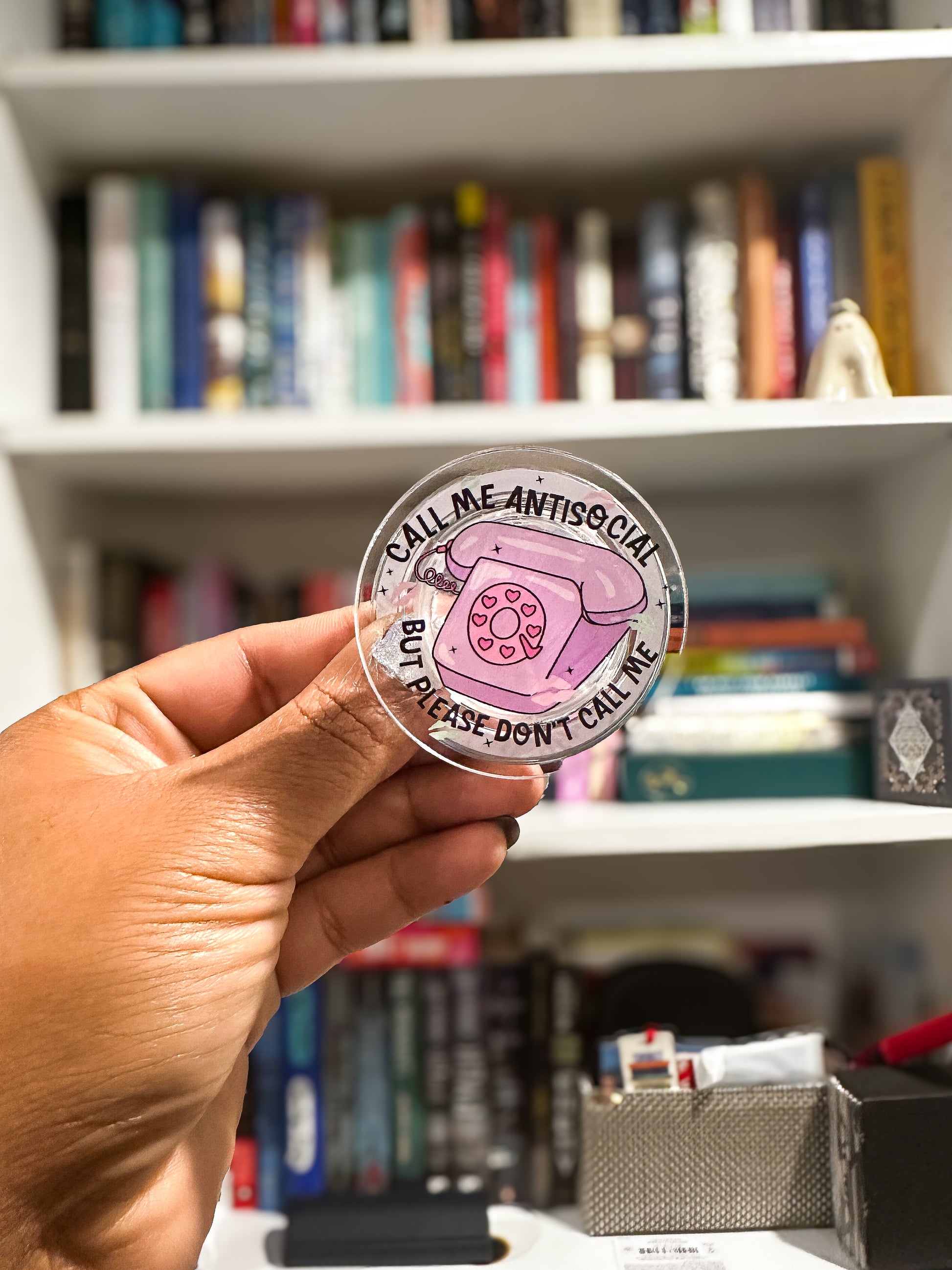 This magnetic grip says it all so you don’t have to. Featuring a retro pink rotary phone with heart-shaped buttons and bold black lettering, this grip is the perfect accessory for introverts, texters, and anyone who breaks into a cold sweat at the sound of a ringtone. The pastel aesthetic adds a soft touch, while the message keeps boundaries crystal clear.