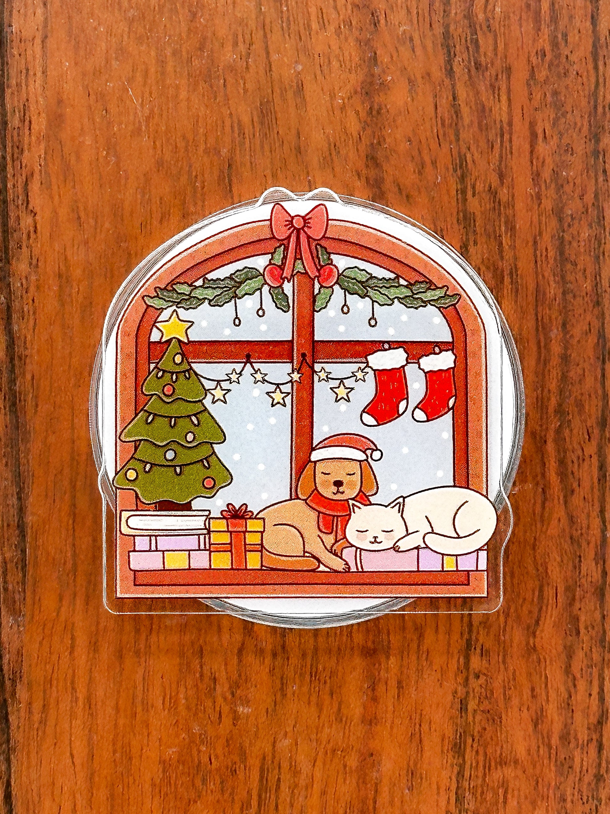 🐶 Features a festive window scene with a napping dog, cat, and Christmas tree