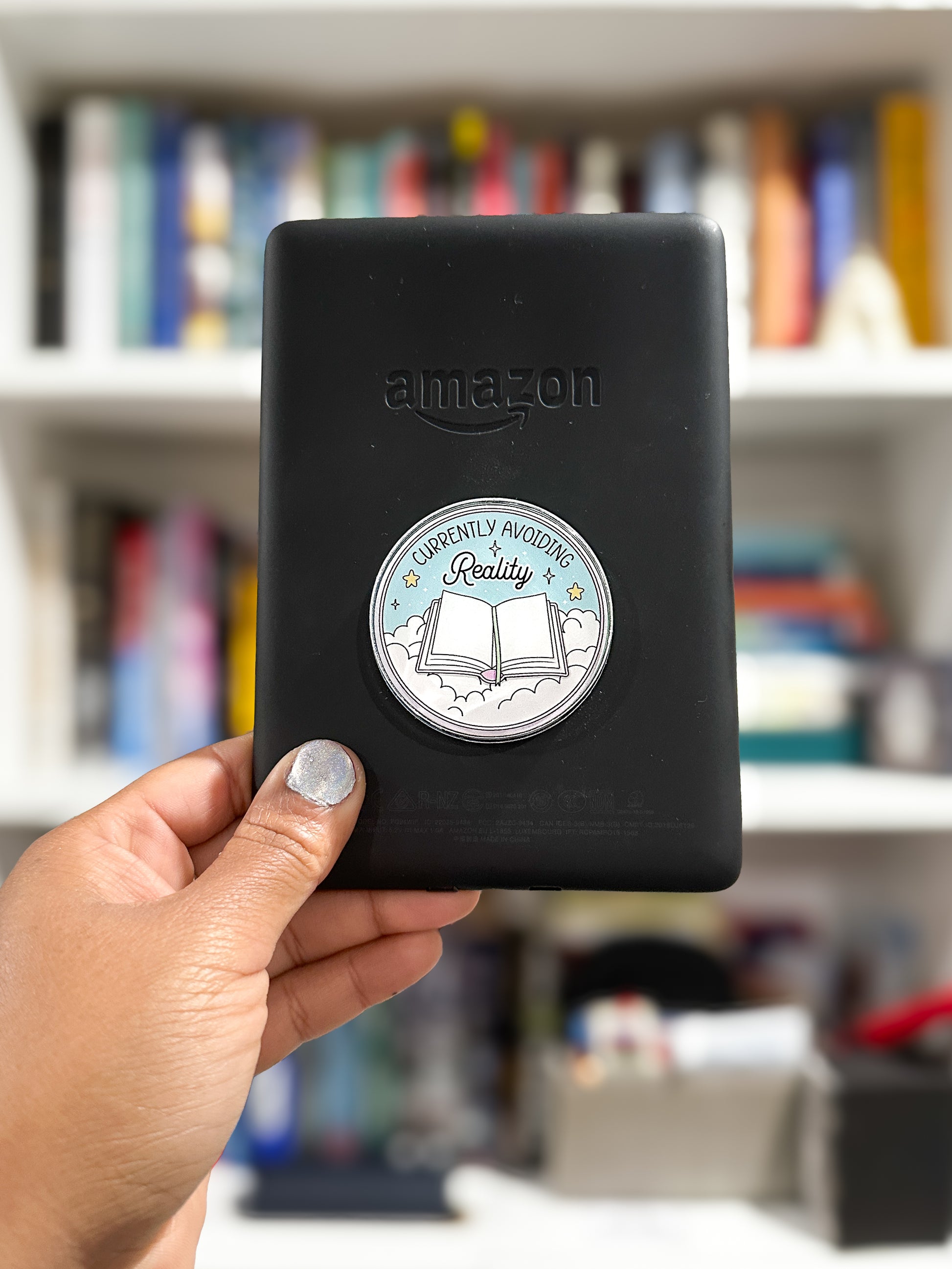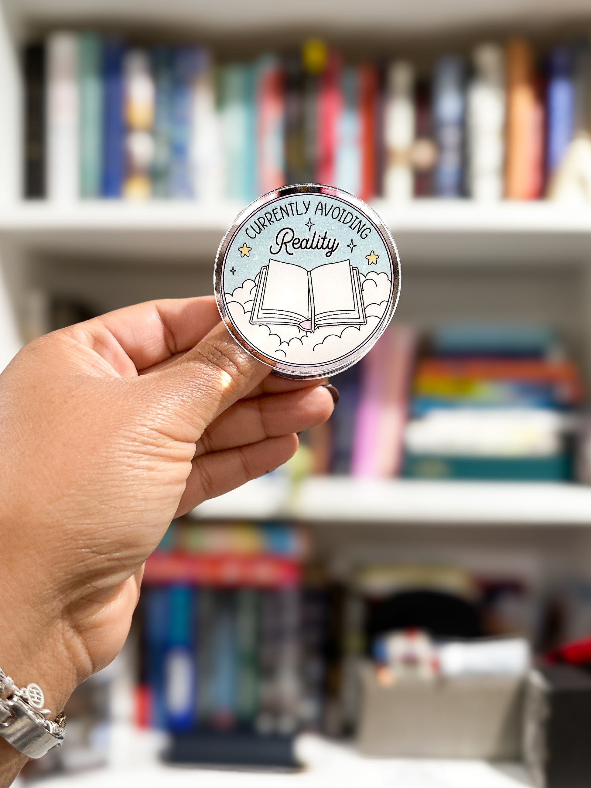 This magnetic grip features a dreamy open book floating in the clouds with the painfully relatable phrase: Currently Avoiding Reality. Perfect for readers who use stories as a coping mechanism (hi, it’s us). Whether you’re deep into your Kindle, scrolling BookTok, or mentally living in a fictional world, this grip is here to support your escape.