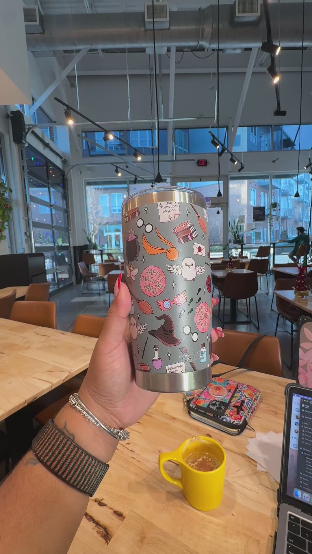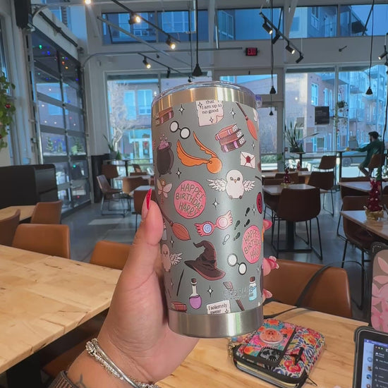 This stainless steel tumbler features a playful, all-over magical icon pattern inspired by a beloved wizarding aesthetic—think owls, spell bottles, broomsticks, letters, potions, and subtle nods that fans will recognize without ever saying the name. Whimsical, nostalgic, and full of charm, it’s perfect for anyone who still believes a little magic belongs in everyday life.